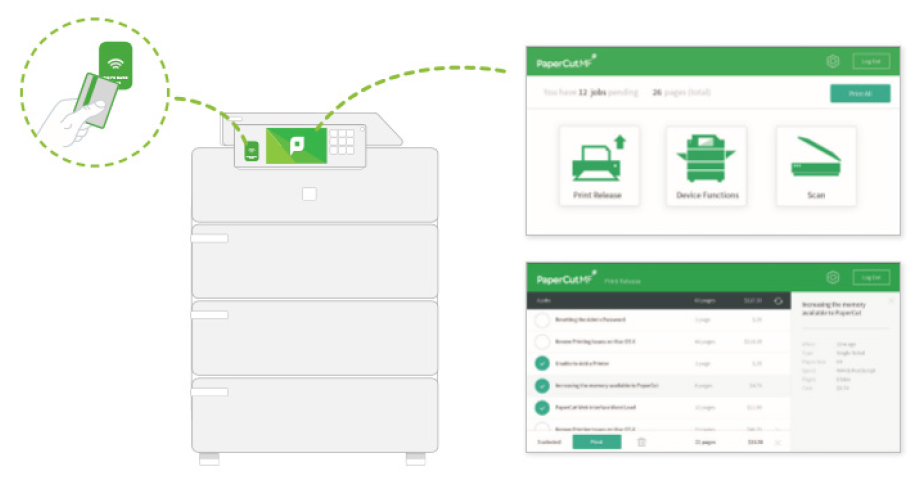 Increasing document security is the main reason that PaperCut™ is installed in offices worldwide. PaperCut™ protects sensitive documents with Find-Me printing. Users print to a global virtual queue and can release their documents securely while at the device. Devices can also be secured with user authentication via a touch screen or card reader at the MFD. Sensitive documents can also be given an additional layer of security by using watermarking and digital signatures to include the owner ID on every document.